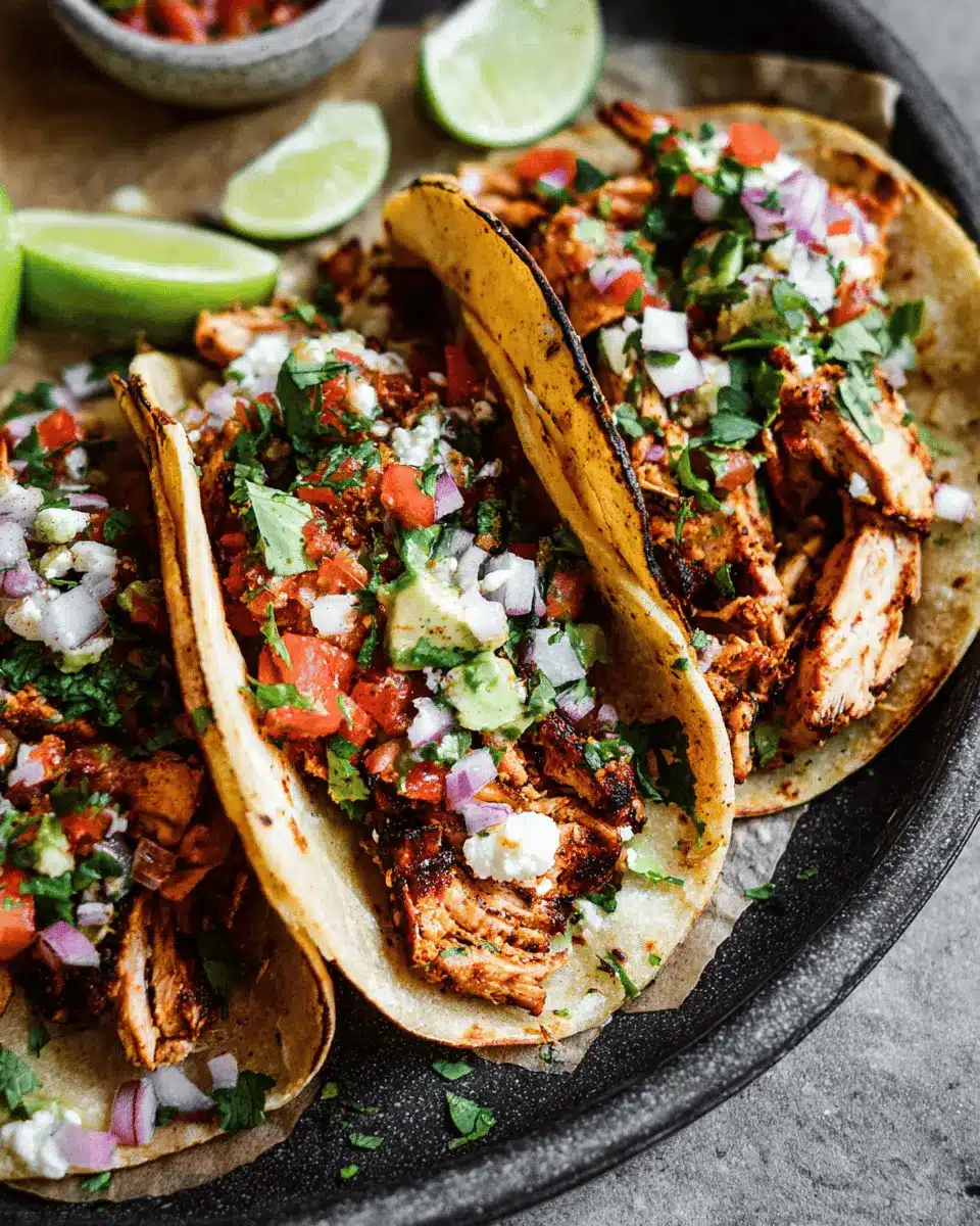 Finally, it's assembly time! Layer two warmed corn tortillas together, then top with your chopped chicken. Add a generous helping of pico de gallo and a sprinkle of fresh cilantro. Consider other optional toppings like guacamole, sour cream, or pickled red onions to elevate your tacos. Don’t forget a lime wedge on the side for that zesty squeeze that ties it all together.