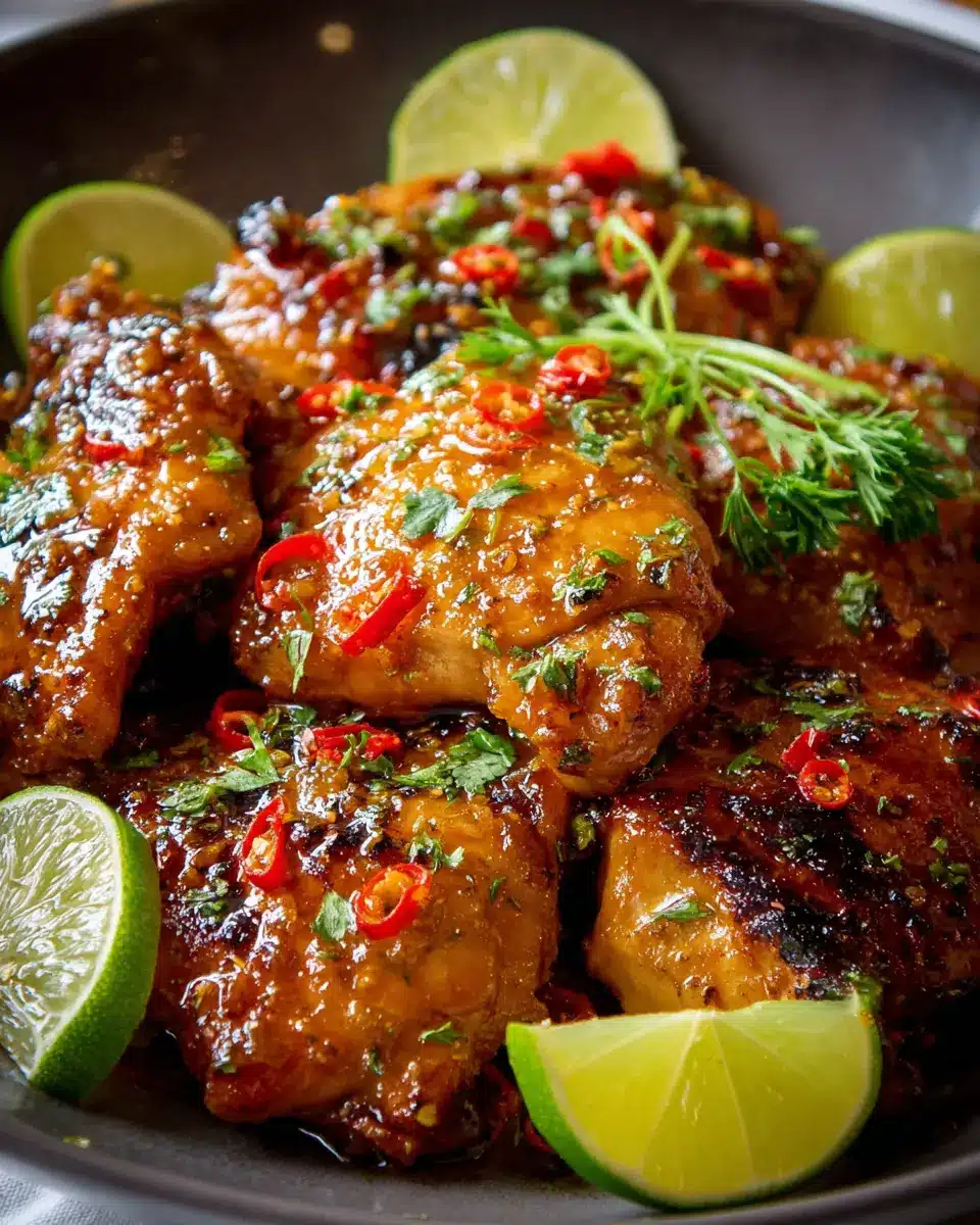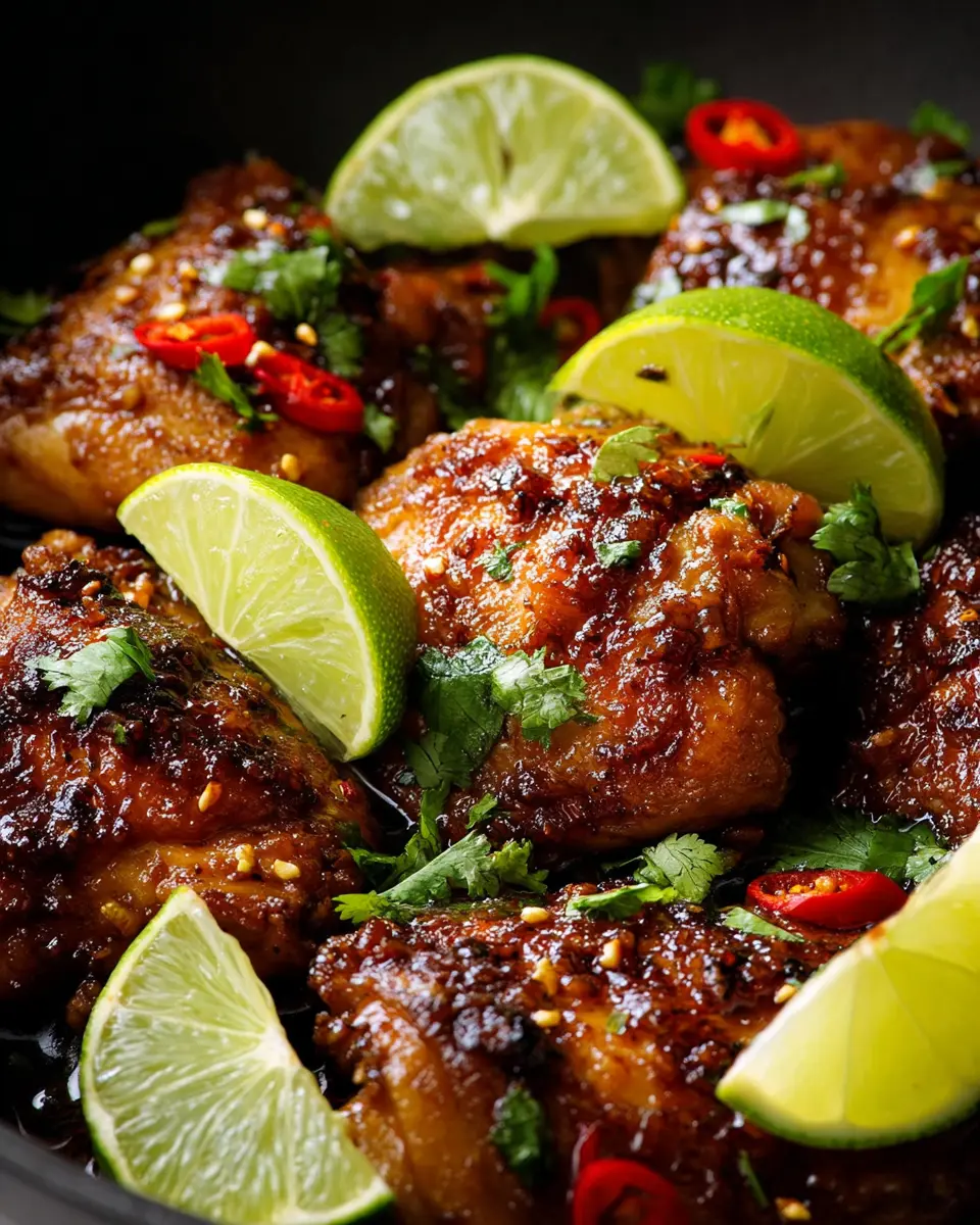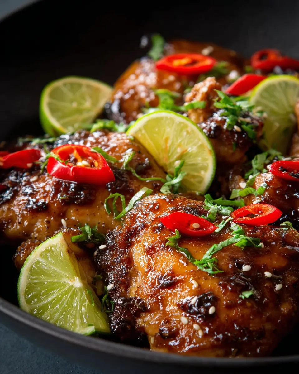 Reduce the heat and let your chilli lime chicken simmer for about 5 minutes, allowing the sauce to thicken and hug the chicken. You'll notice it becoming sticky and luscious, coating the thighs beautifully.