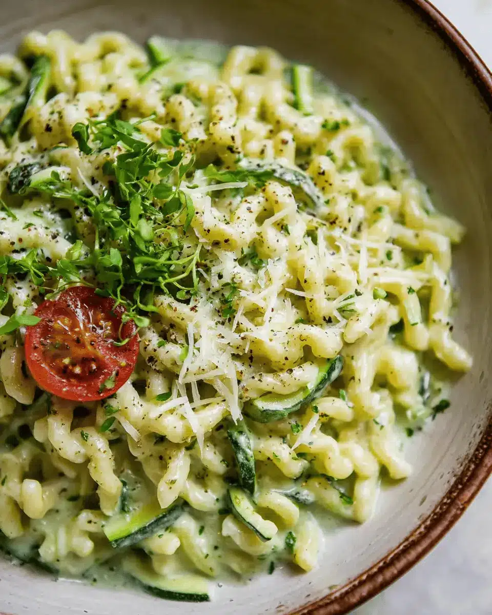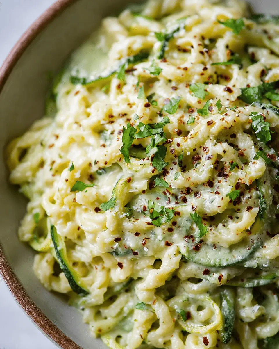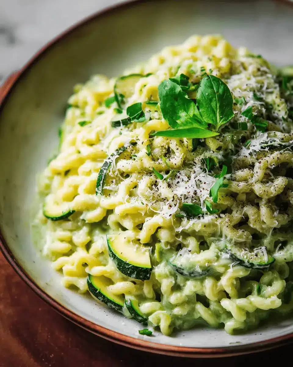Creamy zucchini pasta can be enjoyed by various dietary preferences. It’s vegetarian-friendly, and can easily be made gluten-free by using gluten-free pasta. For those monitoring their calorie intake or looking to make it lighter, consider substituting heavy cream with a lighter option like Greek yogurt, or reducing the amount of cheese.