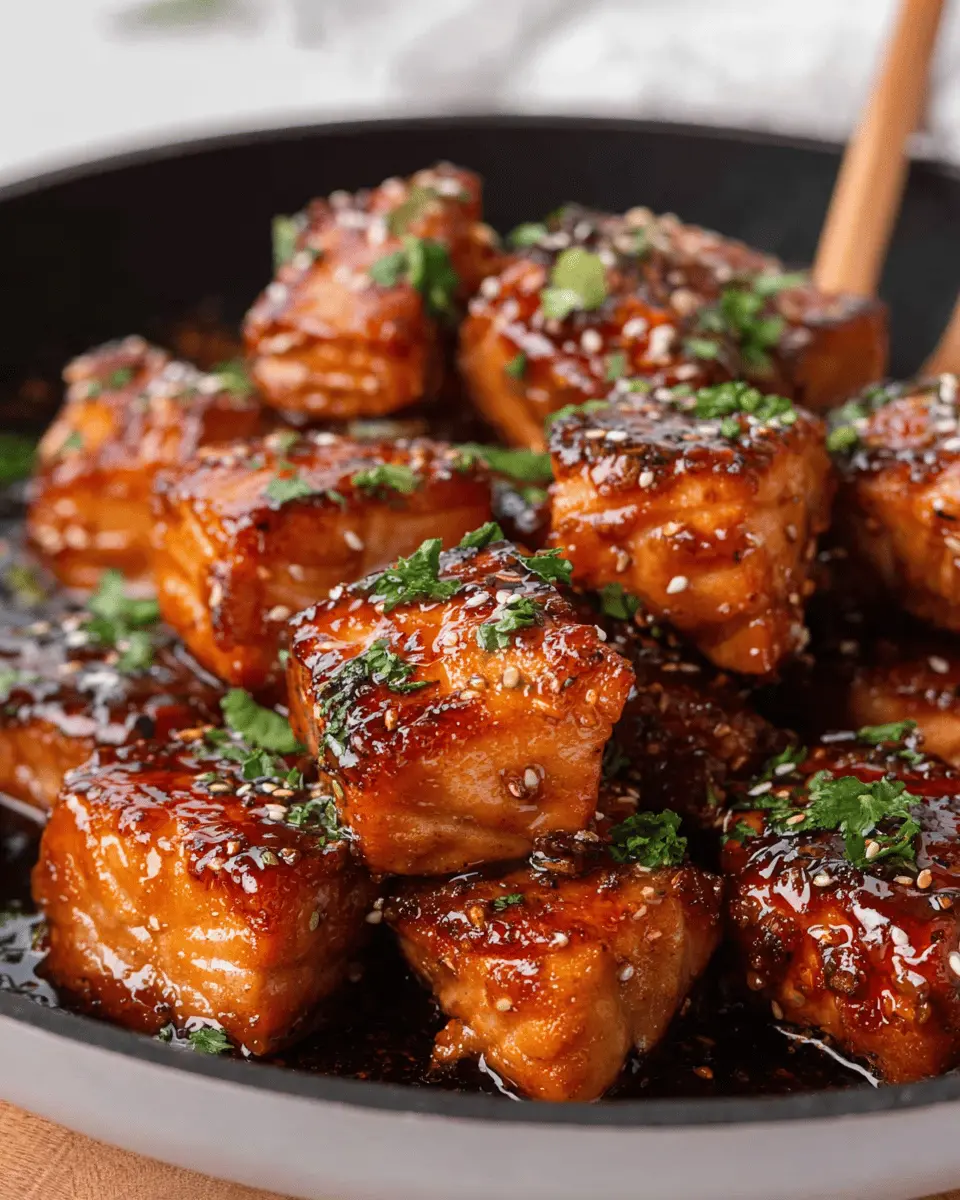 Crispy, Saucy Honey Garlic Salmon Bites in a Skillet