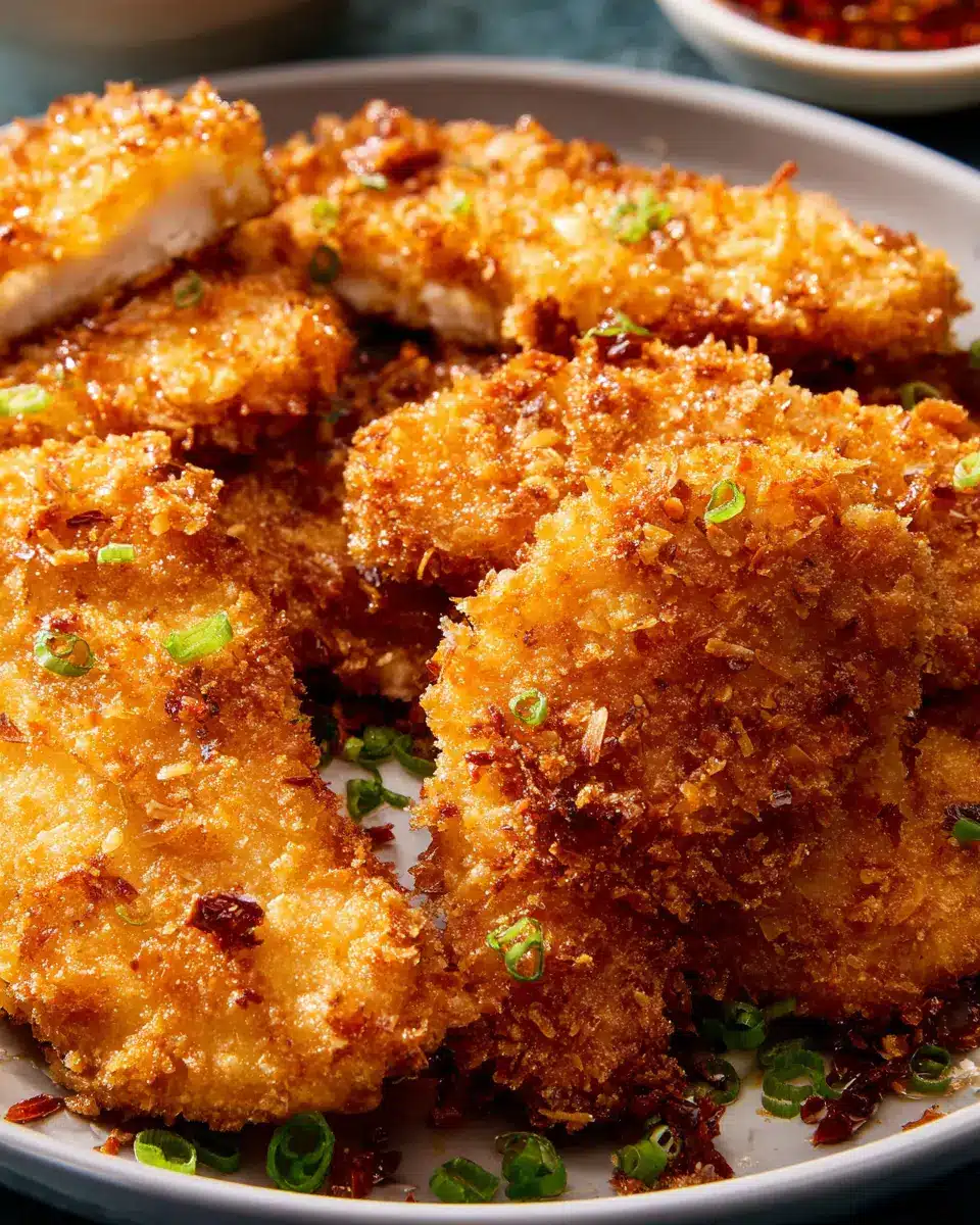 No panko? No problem! You can make a substitute by using regular bread crumbs; however, for a crunchier texture, try crushing cornflakes or using crushed crackers. If you have coconut flakes on hand, mixing them with some finely ground oats can also yield a delightful coating for your crunchy coconut chicken.