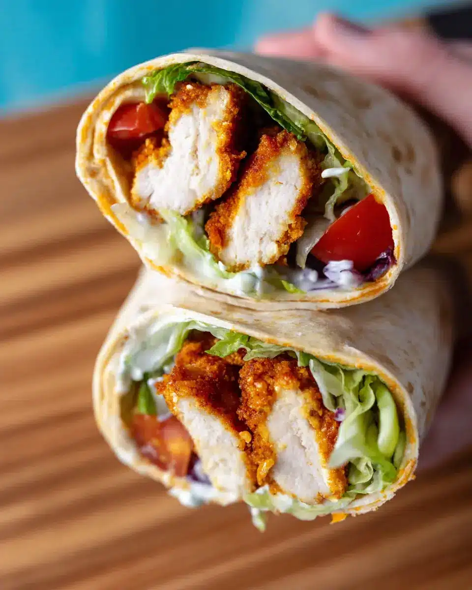 A serving of this healthy crispy chicken wrap packs approximately 699 calories, making it a filling option that won’t have you feeling deprived.