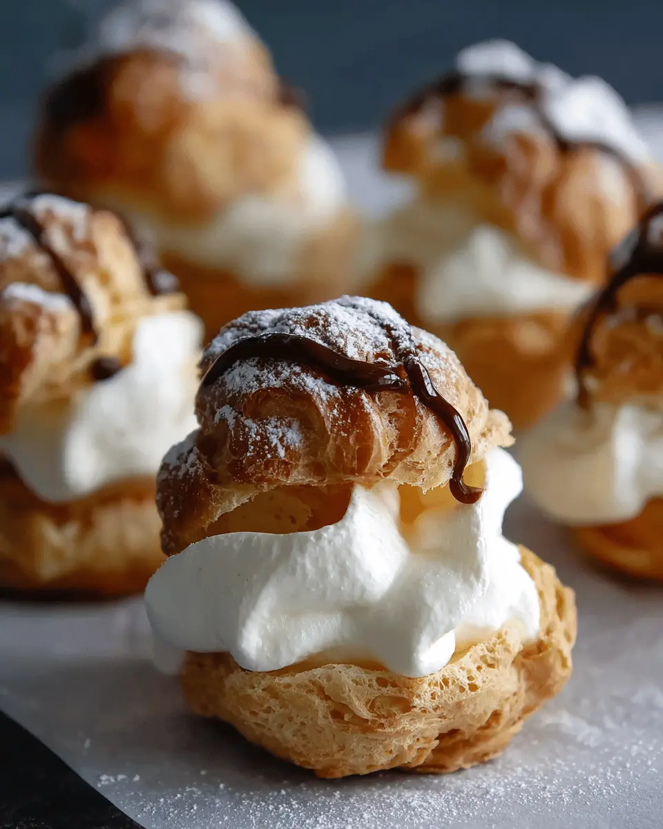 Finally, slice the cooled puffs in half and pipe the whipped cream inside, or just dollop it in with a spoon for a more rustic feel. Dust with powdered sugar before serving, and enjoy the delightful surprise of fluffy cream inside a crispy shell.