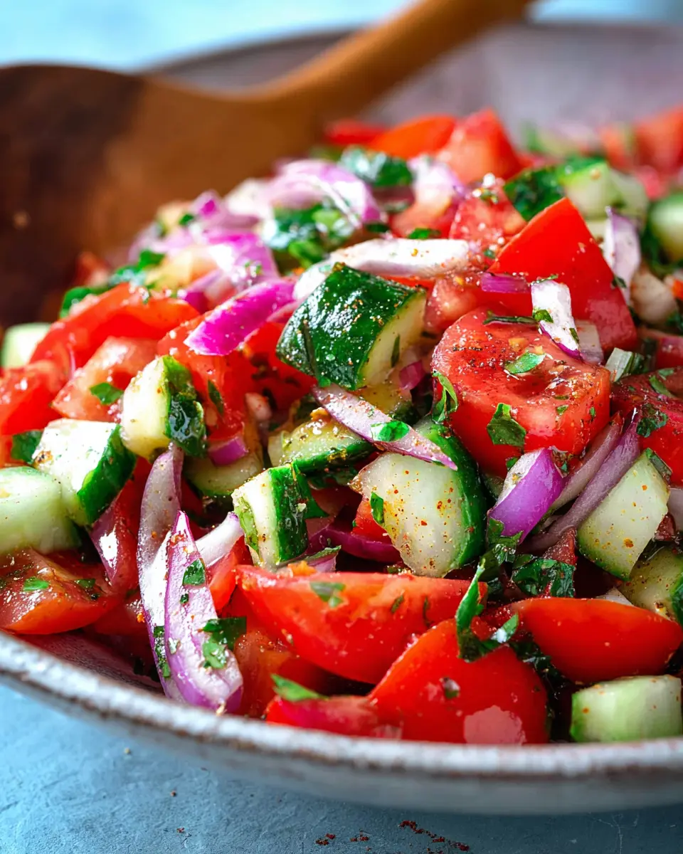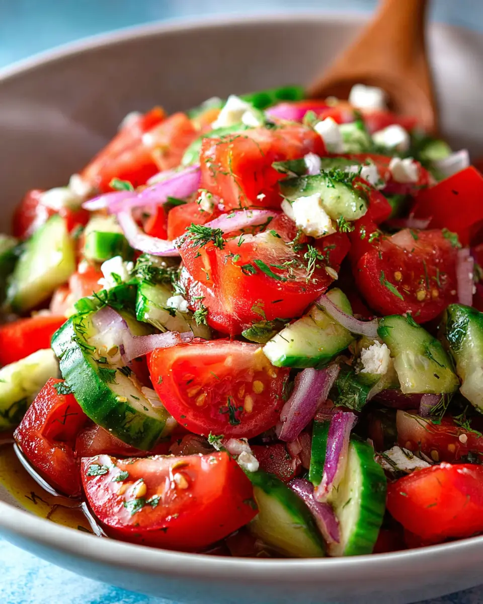 Don’t be afraid to mix it up with seasonal veggies! In the summer, add fresh corn or diced radishes for a sweet crunch, while in the fall, replace tomatoes with roasted butternut squash for a fine twist. By experimenting with different ingredients, your Mediterranean Salad with Tomato and Cucumber will remain a delightful staple that you can enjoy all year round! For inspiration, check out seasonal produce guides here.