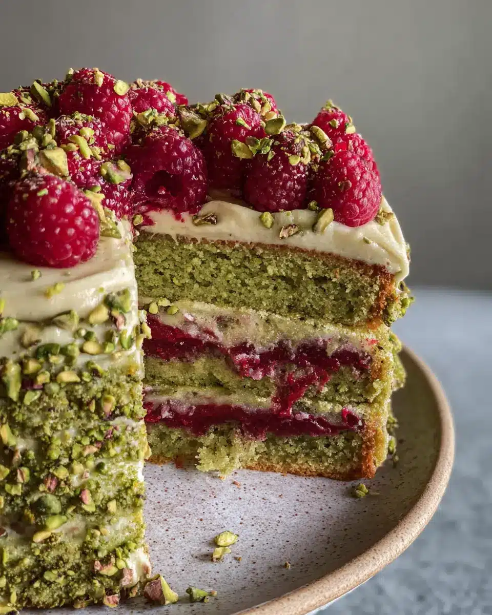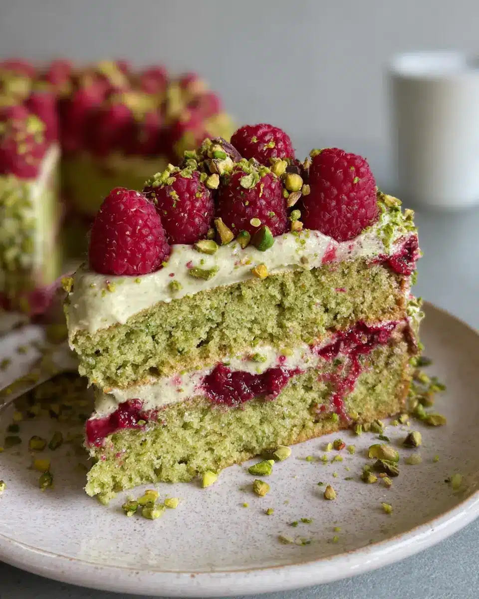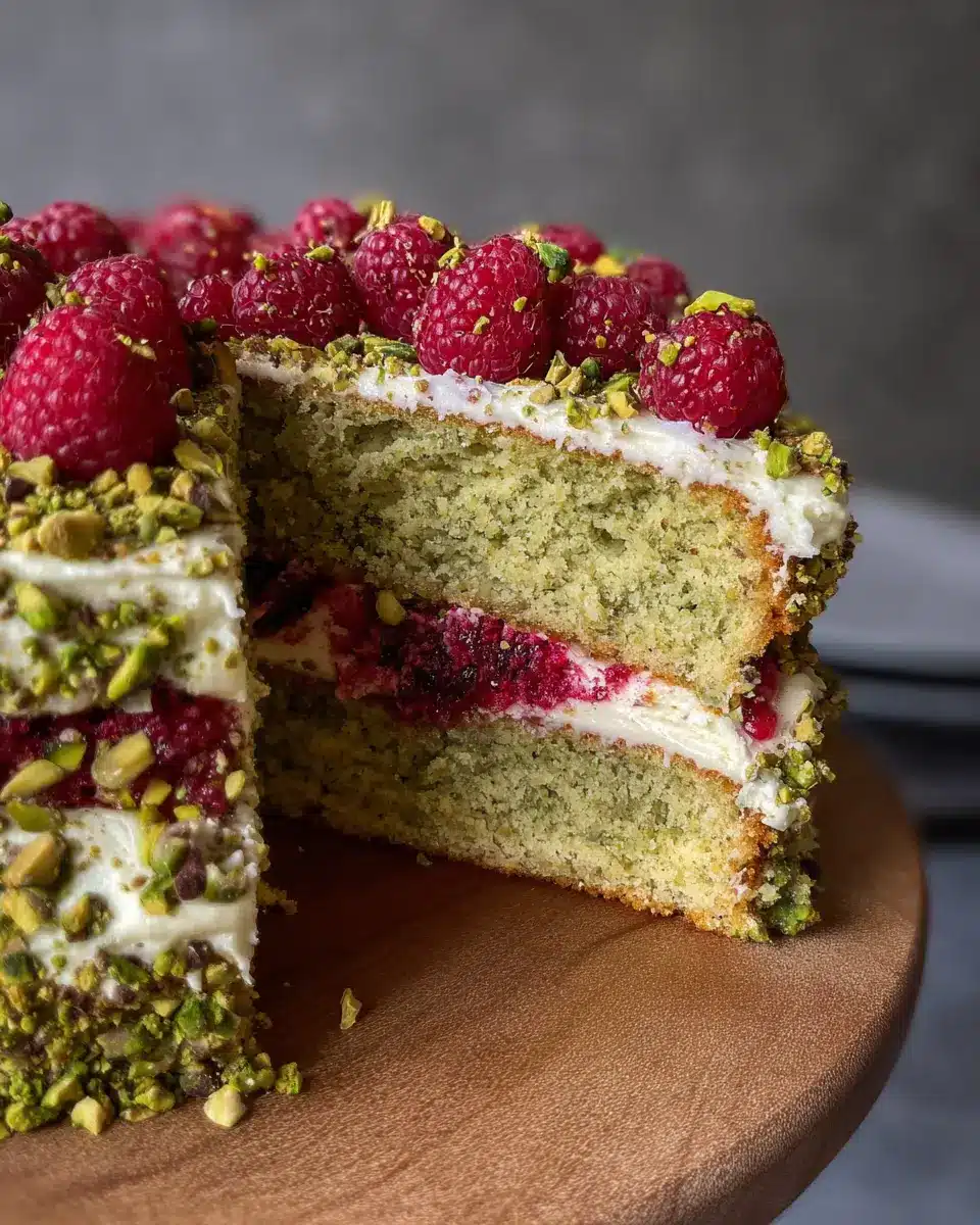 Absolutely! If you have dietary restrictions, you can easily modify this Pistachio Raspberry Cake. For a gluten-free option, swap the plain flour with a 1:1 gluten-free flour blend. You can also replace eggs with a flaxseed meal (1 tablespoon of flaxseed mixed with 3 tablespoons of water for each egg) or applesauce for a vegan version. For those avoiding dairy, use plant-based butter and dairy-free cream for the buttercream.