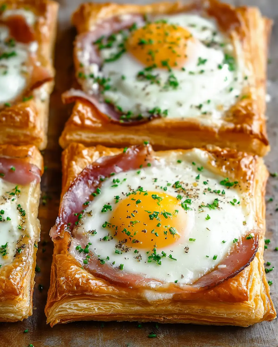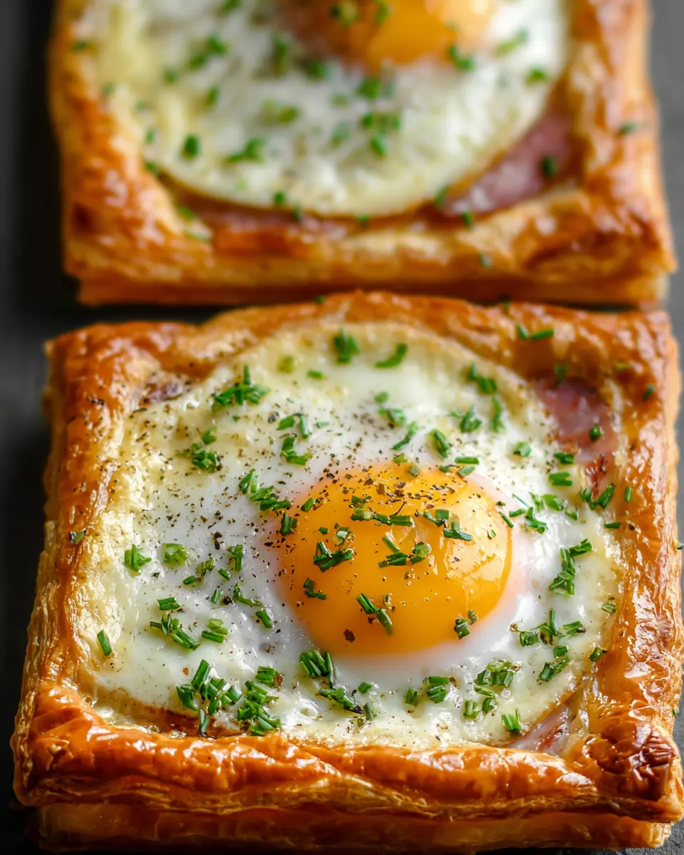 Finally, crack an egg into the well of each pastry and season with salt and pepper to taste. This is the moment that truly transforms your Puff Pastry Croque Madame into a satisfying dish. Return the pastries to the oven and bake for another 10 minutes until the egg whites are set, but the yolks remain deliciously runny. The result? An indulgent, savory delight topped with chives for garnish!