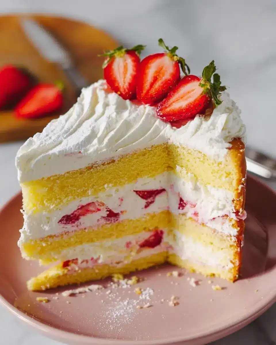Now for the fun part—layering! Carefully slice each cooled cake horizontally into two layers. On your serving plate, place one of the bottom layers as the base. Spread half of the strawberry mixture over this layer. Then, add the second layer of cake and spread a generous portion of custard over it. Repeat this process with the third layer and the remaining strawberry mixture before placing the final cake layer on top. Finish with the rest of the whipped topping to create a smooth, luxurious finish.