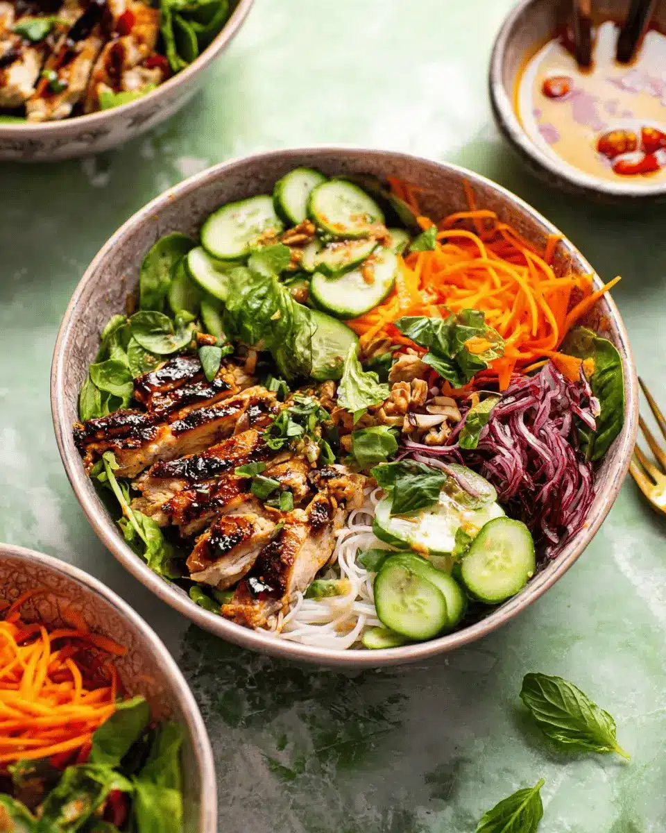 Now comes the fun part! Take your prepared rice noodles and layer them into bowls. Add a handful of spring greens, sliced cucumbers, and matchstick carrots. Top it all off with those beautifully grilled chicken slices and drizzle with the reserved marinade for that extra kick. Finish with a generous garnish of fresh herbs, like Thai basil, mint, and cilantro.