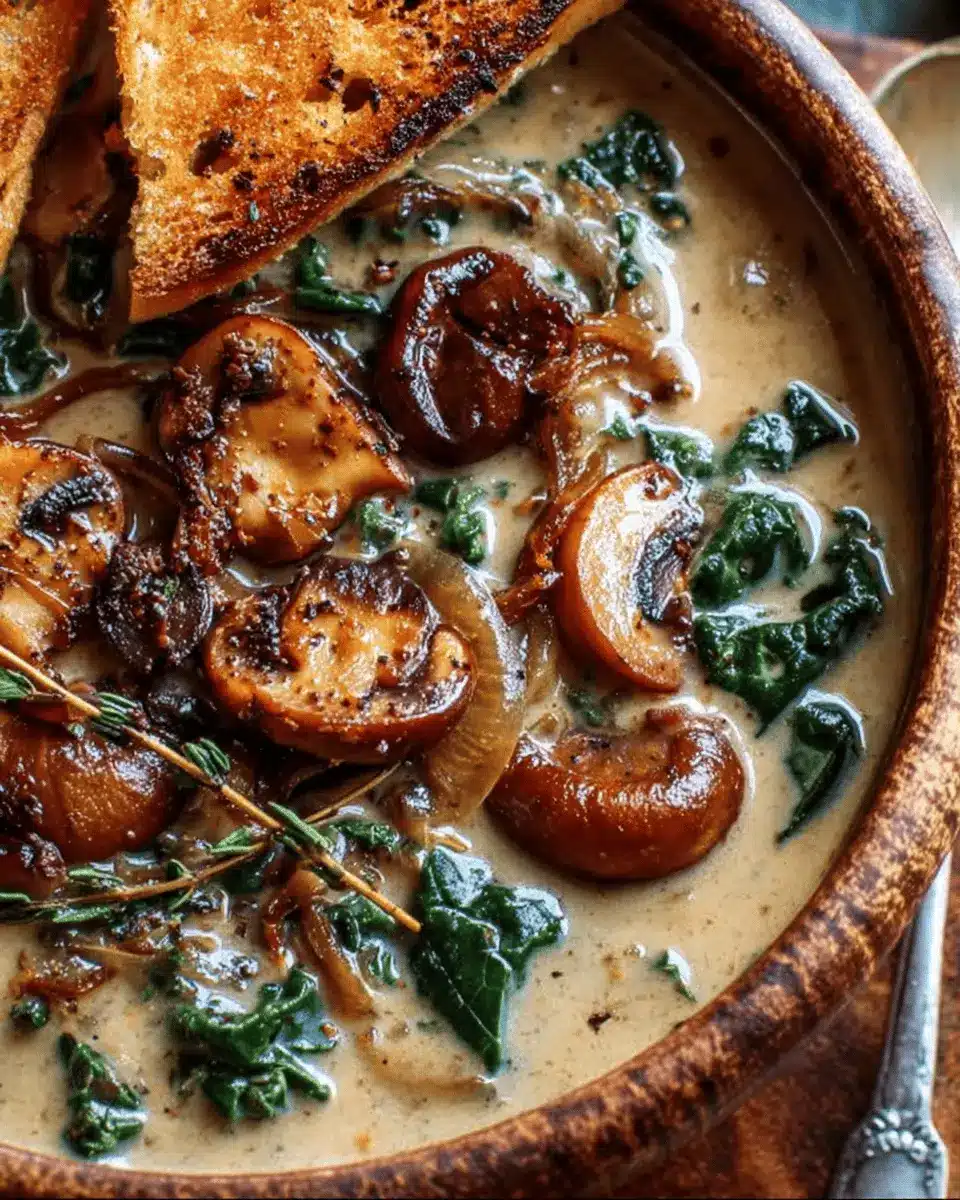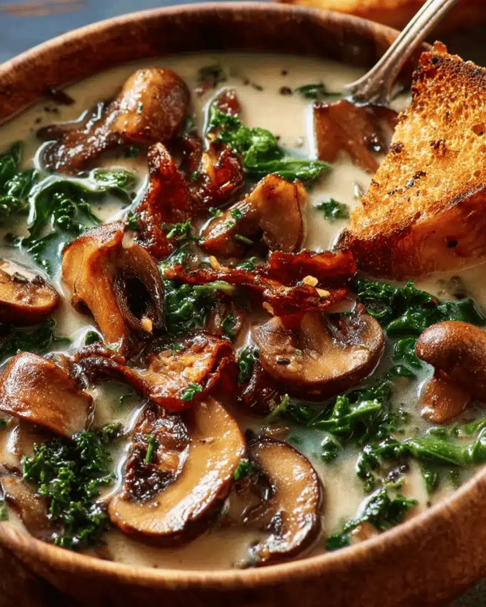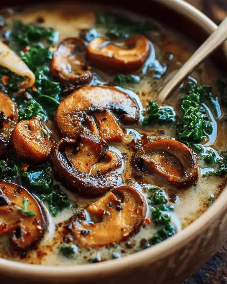 Wild Mushroom, Caramelized Onion and Kale Soup